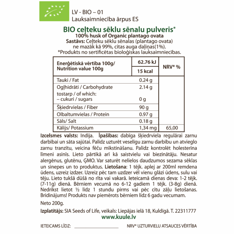 Sastāvdaļas: ceļteku sēklu sēnalu pulveris.* Produkti no sertificētas bioloģiskās lauksaimniecības.